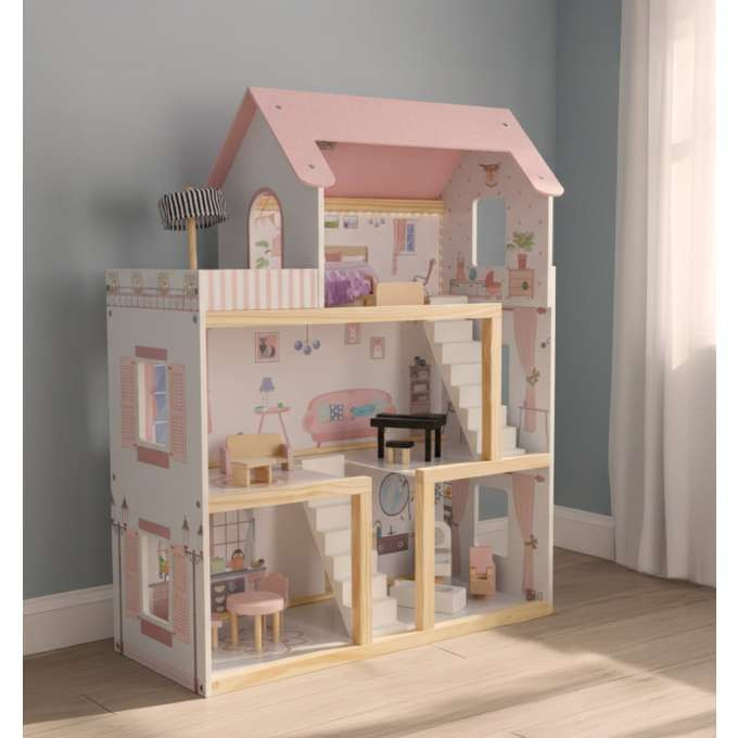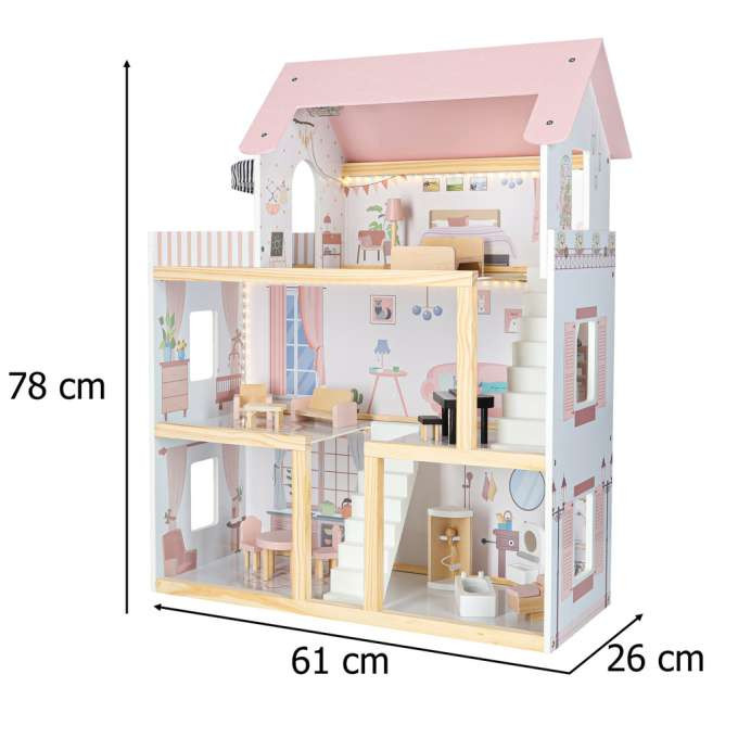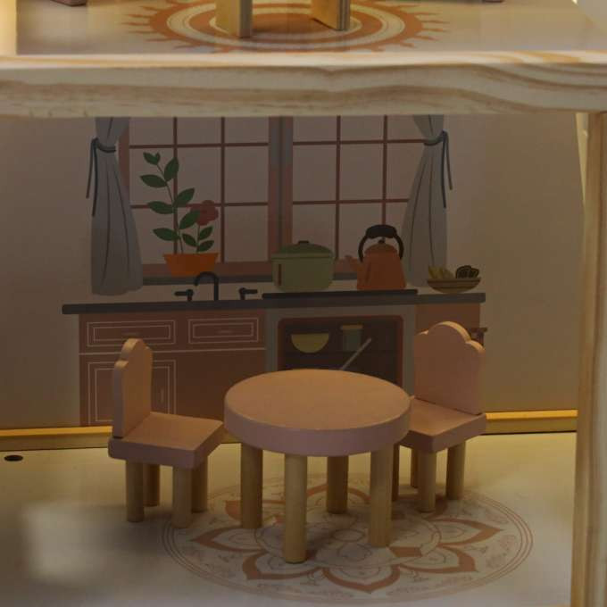 Ez a LED-es világítású babaház pasztellszíneivel – a finom rózsaszín, fehér és natúr fa kombinációjával – rabul ejti a látogatókat . Nem csupán játék, hanem egy bájos kiegészítője is egy gyerekszobának. A meleg LED-es világítás varázslatos bájt kölcsönöz a belső térnek, és meghitt hangulatot teremt az esti babázáshoz.